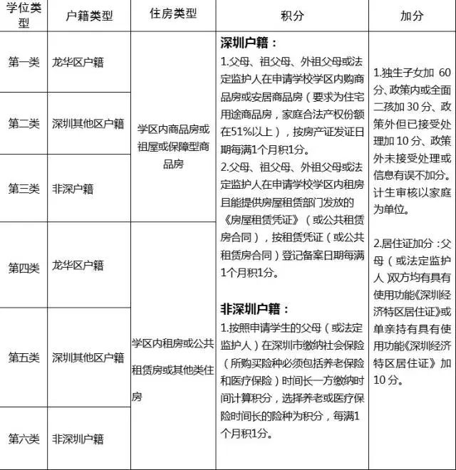 龙华区幼儿园学位类型和积分参照表